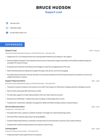 Build a professional support lead resume in minutes. Browse through our resume examples to identify the best way to word your resume. Then choose from 5+ resume templates to create your support lead resume.