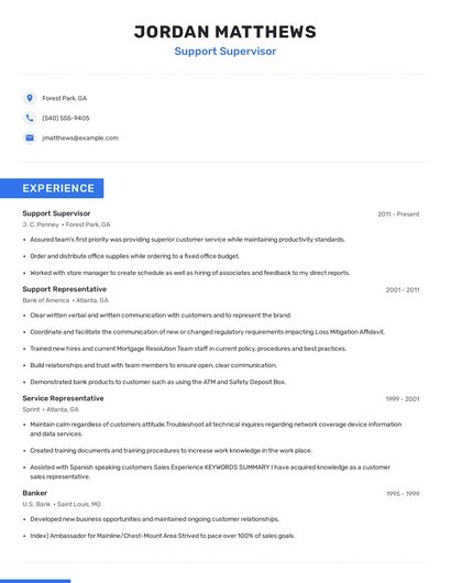 Build a professional support supervisor resume in minutes. Browse through our resume examples to identify the best way to word your resume. Then choose from 5+ resume templates to create your support supervisor resume.