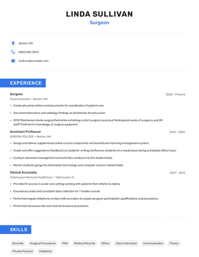 Build a professional surgeon resume in minutes. Browse through our resume examples to identify the best way to word your resume. Then choose from 5+ resume templates to create your surgeon resume.
