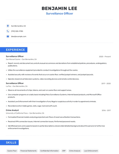 Build a professional surveillance officer resume in minutes. Our AI resume writing assistant will guide you through every step of the process, and you can choose from 10+ resume templates to create your surveillance officer resume.7. Casino Games