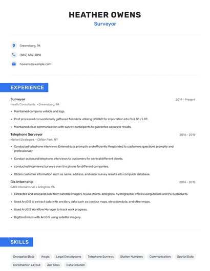 Build a professional surveyor resume in minutes. Browse through our resume examples to identify the best way to word your resume. Then choose from 5+ resume templates to create your surveyor resume.
