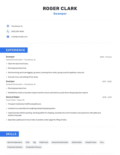 Build a professional swamper resume in minutes. Our AI resume writing assistant will guide you through every step of the process, and you can choose from 10+ resume templates to create your swamper resume.7. Oilfield Equipment
