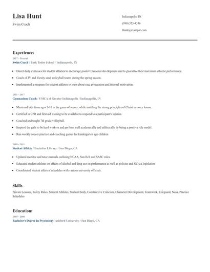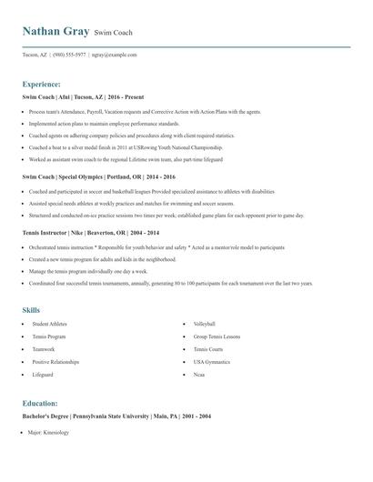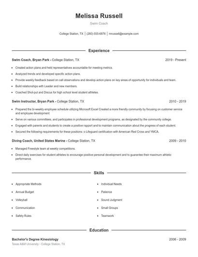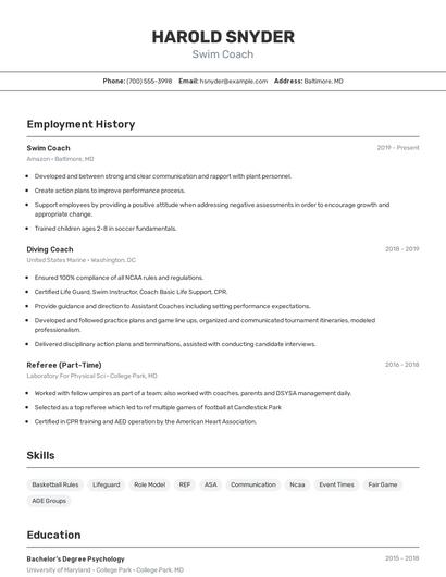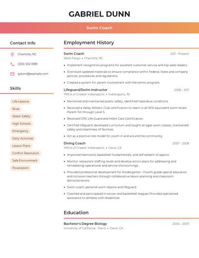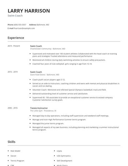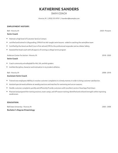 Build a professional swim coach resume in minutes. Our AI resume writing assistant will guide you through every step of the process, and you can choose from 10+ resume templates to create your swim coach resume.Compare different swim coaches