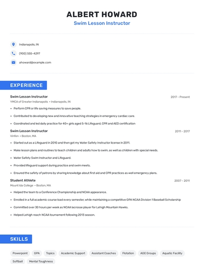 Build a professional swim lesson instructor resume in minutes. Browse through our resume examples to identify the best way to word your resume. Then choose from 5+ resume templates to create your swim lesson instructor resume.