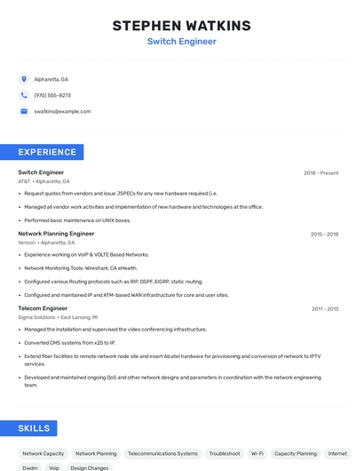 Build a professional switch engineer resume in minutes. Browse through our resume examples to identify the best way to word your resume. Then choose from 5+ resume templates to create your switch engineer resume.