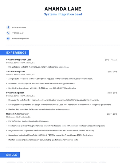 Build a professional systems integration lead resume in minutes. Browse through our resume examples to identify the best way to word your resume. Then choose from 5+ resume templates to create your systems integration lead resume.