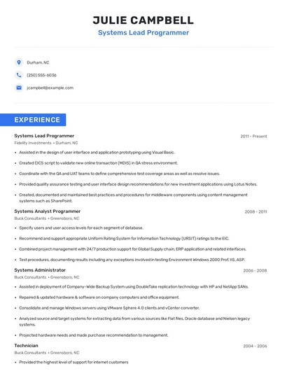 Build a professional systems lead programmer resume in minutes. Browse through our resume examples to identify the best way to word your resume. Then choose from 5+ resume templates to create your systems lead programmer resume.