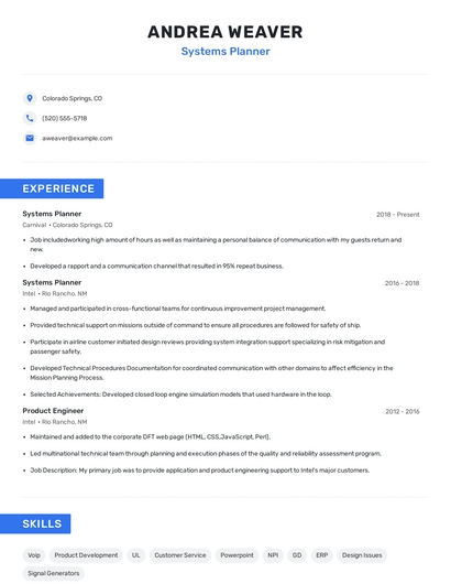 Build a professional systems planner resume in minutes. Browse through our resume examples to identify the best way to word your resume. Then choose from 5+ resume templates to create your systems planner resume.