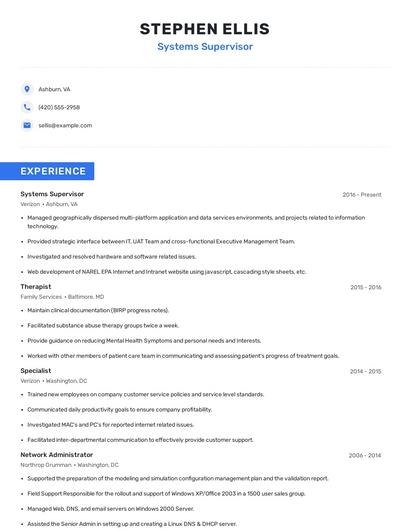 Build a professional systems supervisor resume in minutes. Browse through our resume examples to identify the best way to word your resume. Then choose from 5+ resume templates to create your systems supervisor resume.