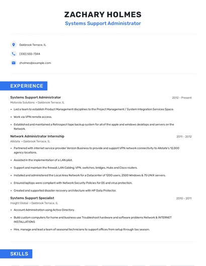 Build a professional systems support administrator resume in minutes. Browse through our resume examples to identify the best way to word your resume. Then choose from 5+ resume templates to create your systems support administrator resume.