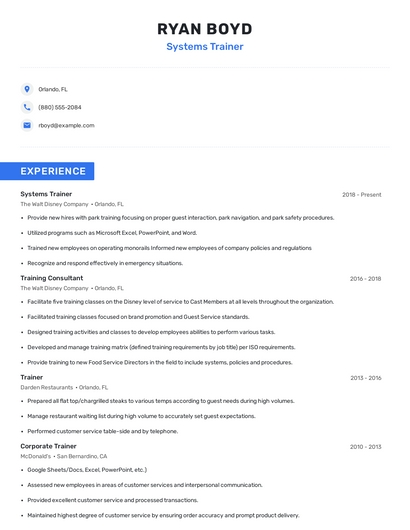 Build a professional systems trainer resume in minutes. Browse through our resume examples to identify the best way to word your resume. Then choose from 5+ resume templates to create your systems trainer resume.
