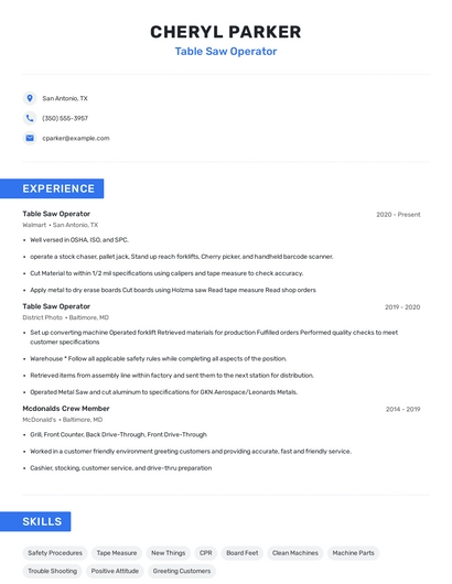 The most important skills for a table saw operator resume and required skills for a table saw operator to have include:
