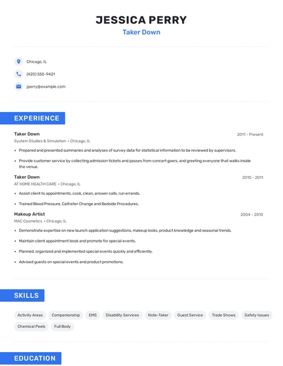 Build a professional taker down resume in minutes. Our AI resume writing assistant will guide you through every step of the process, and you can choose from 10+ resume templates to create your taker down resume.7. Party Claims