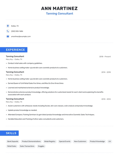 Build a professional tanning consultant resume in minutes. Browse through our resume examples to identify the best way to word your resume. Then choose from 5+ resume templates to create your tanning consultant resume.