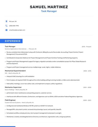 Build a professional task manager resume in minutes. Browse through our resume examples to identify the best way to word your resume. Then choose from 5+ resume templates to create your task manager resume.