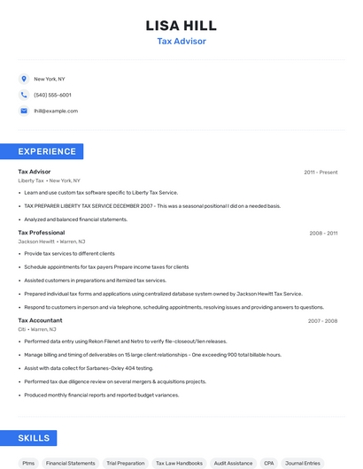 Build a professional tax advisor resume in minutes. Browse through our resume examples to identify the best way to word your resume. Then choose from 5+ resume templates to create your tax advisor resume.