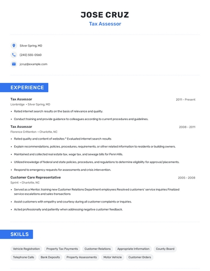 Build a professional tax assessor resume in minutes. Browse through our resume examples to identify the best way to word your resume. Then choose from 5+ resume templates to create your tax assessor resume.