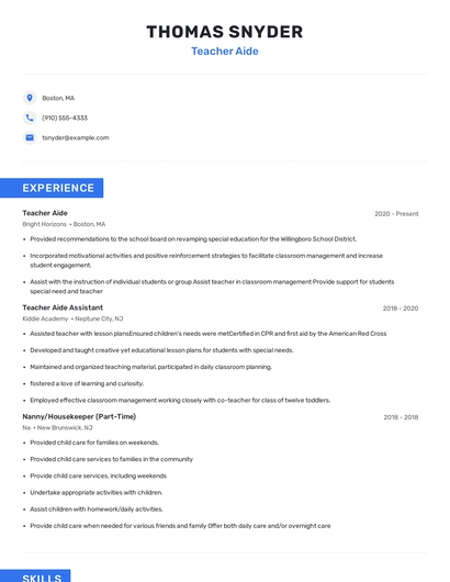 Build a professional teacher aide resume in minutes. Browse through our resume examples to identify the best way to word your resume. Then choose from 5+ resume templates to create your teacher aide resume.