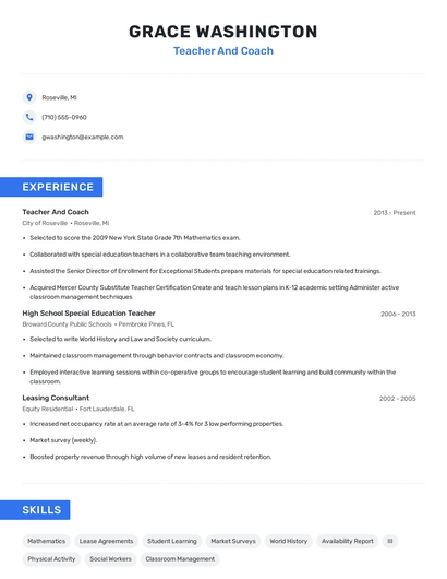 Choose from 10+ customizable teacher and coach resume templates