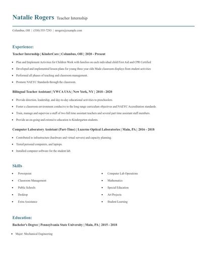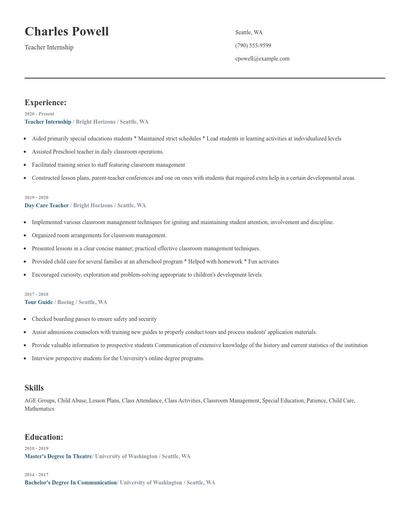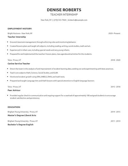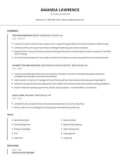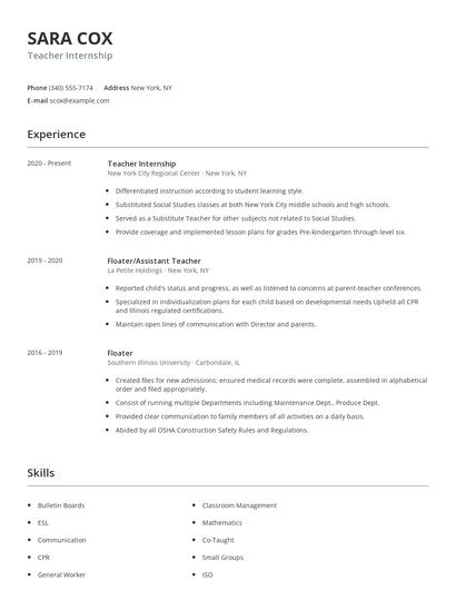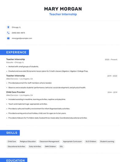You can use Zippia's AI resume builder to make the resume writing process easier while also making sure that you include key information that hiring managers expect to see on a teacher internship resume. You'll find resume tips and examples of skills, responsibilities, and summaries, all provided by Zippi, your career sidekick.