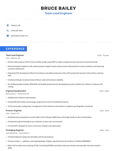 Build a professional team lead engineer resume in minutes. Browse through our resume examples to identify the best way to word your resume. Then choose from 5+ resume templates to create your team lead engineer resume.