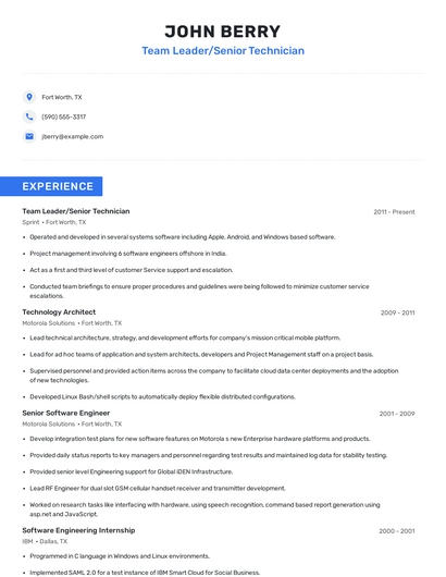 Build a professional team leader/senior technician resume in minutes. Browse through our resume examples to identify the best way to word your resume. Then choose from 5+ resume templates to create your team leader/senior technician resume.
