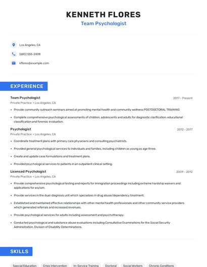 Build a professional team psychologist resume in minutes. Our AI resume writing assistant will guide you through every step of the process, and you can choose from 10+ resume templates to create your team psychologist resume.7. Risk Assessments
