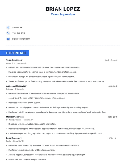 Build a professional team supervisor resume in minutes. Browse through our resume examples to identify the best way to word your resume. Then choose from 5+ resume templates to create your team supervisor resume.