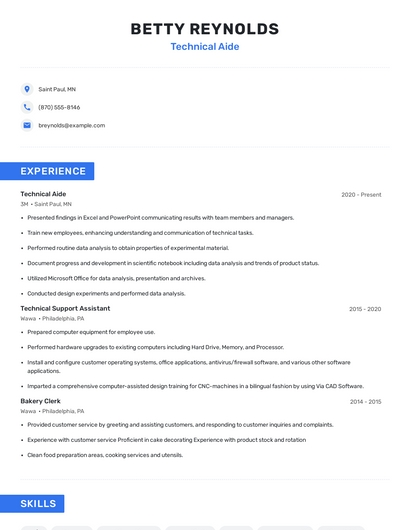 Build a professional technical aide resume in minutes. Browse through our resume examples to identify the best way to word your resume. Then choose from 5+ resume templates to create your technical aide resume.