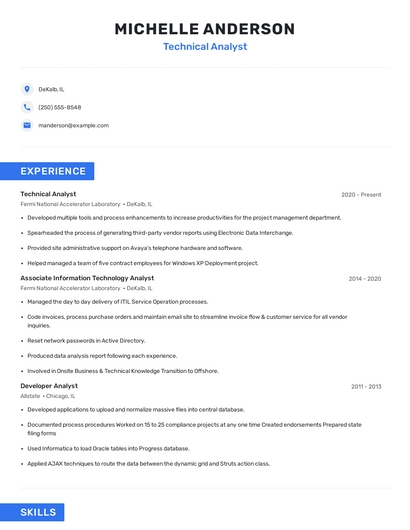 Build a professional technical analyst resume in minutes. Browse through our resume examples to identify the best way to word your resume. Then choose from 5+ resume templates to create your technical analyst resume.