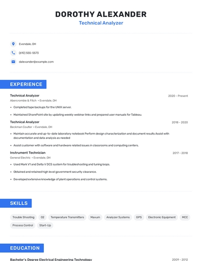 Build a professional technical analyzer resume in minutes. Our AI resume writing assistant will guide you through every step of the process, and you can choose from 10+ resume templates to create your technical analyzer resume.7. ABB