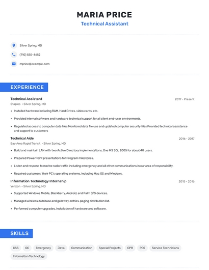 Build a professional technical assistant resume in minutes. Browse through our resume examples to identify the best way to word your resume. Then choose from 5+ resume templates to create your technical assistant resume.