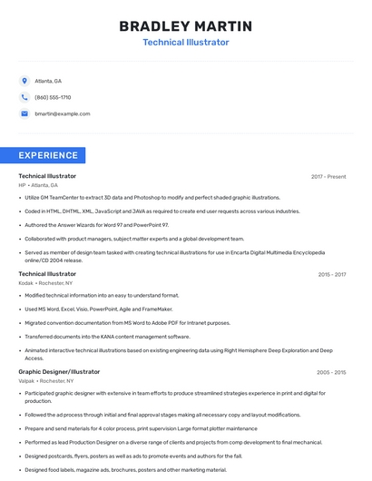Build a professional technical illustrator resume in minutes. Browse through our resume examples to identify the best way to word your resume. Then choose from 5+ resume templates to create your technical illustrator resume.