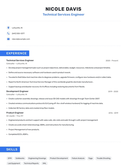 Build a professional technical services engineer resume in minutes. Browse through our resume examples to identify the best way to word your resume. Then choose from 5+ resume templates to create your technical services engineer resume.