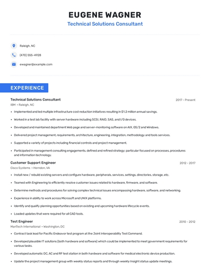 Build a professional technical solutions consultant resume in minutes. Browse through our resume examples to identify the best way to word your resume. Then choose from 5+ resume templates to create your technical solutions consultant resume.