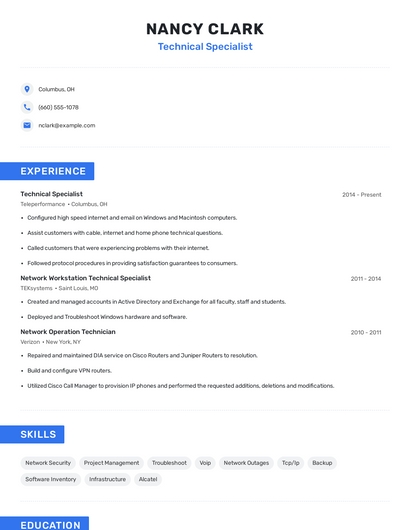Build a professional technical specialist resume in minutes. Browse through our resume examples to identify the best way to word your resume. Then choose from 5+ resume templates to create your technical specialist resume.