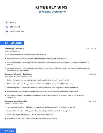 Build a professional technology coordinator resume in minutes. Browse through our resume examples to identify the best way to word your resume. Then choose from 5+ resume templates to create your technology coordinator resume.