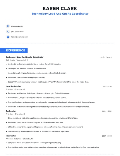 Build a professional technology lead and onsite coordinator resume in minutes. Browse through our resume examples to identify the best way to word your resume. Then choose from 5+ resume templates to create your technology lead and onsite coordinator resume.