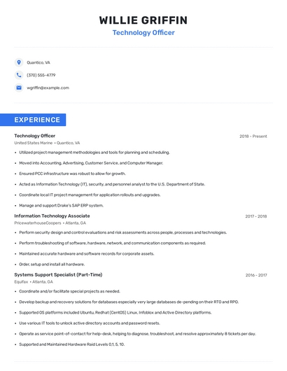 Build a professional technology officer resume in minutes. Browse through our resume examples to identify the best way to word your resume. Then choose from 5+ resume templates to create your technology officer resume.