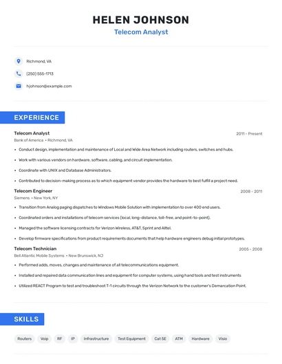 Build a professional telecom analyst resume in minutes. Browse through our resume examples to identify the best way to word your resume. Then choose from 5+ resume templates to create your telecom analyst resume.