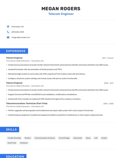 Build a professional telecom engineer resume in minutes. Browse through our resume examples to identify the best way to word your resume. Then choose from 5+ resume templates to create your telecom engineer resume.