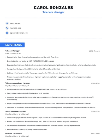 Build a professional telecom manager resume in minutes. Browse through our resume examples to identify the best way to word your resume. Then choose from 5+ resume templates to create your telecom manager resume.