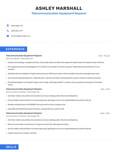 Choose from 10+ customizable telecommunication equipment repairer resume templates