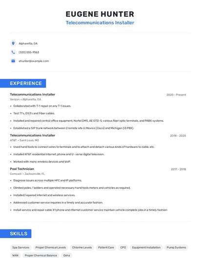 Build a professional telecommunications installer resume in minutes. Browse through our resume examples to identify the best way to word your resume. Then choose from 5+ resume templates to create your telecommunications installer resume.