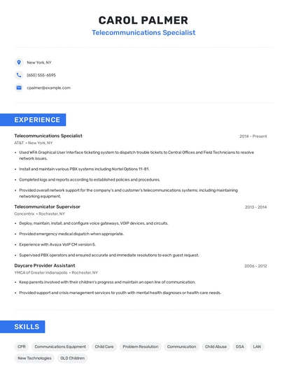 Build a professional telecommunications specialist resume in minutes. Browse through our resume examples to identify the best way to word your resume. Then choose from 5+ resume templates to create your telecommunications specialist resume.