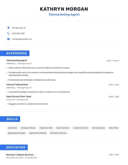 Build a professional telemarketing agent resume in minutes. Browse through our resume examples to identify the best way to word your resume. Then choose from 5+ resume templates to create your telemarketing agent resume.