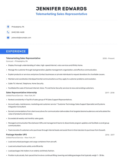 Build a professional telemarketing sales representative resume in minutes. Our AI resume writing assistant will guide you through every step of the process, and you can choose from 10+ resume templates to create your telemarketing sales representative resume.7. Inbound Calls