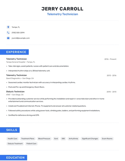 Build a professional telemetry technician resume in minutes. Our AI resume writing assistant will guide you through every step of the process, and you can choose from 10+ resume templates to create your telemetry technician resume.7. ECG