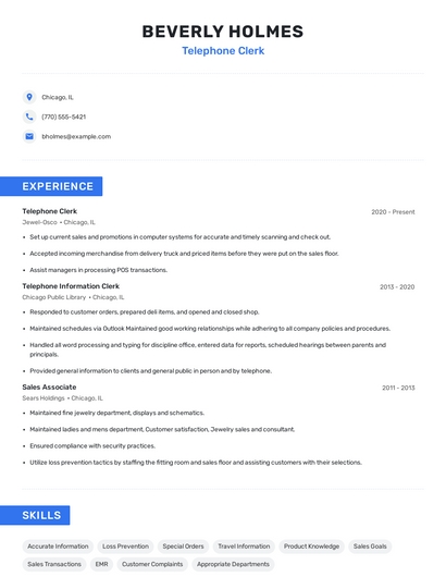 Build a professional telephone clerk resume in minutes. Our AI resume writing assistant will guide you through every step of the process, and you can choose from 10+ resume templates to create your telephone clerk resume.What skills help Telephone Clerks find jobs?