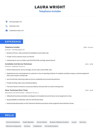 The most important skills for a telephone installer resume and required skills for a telephone installer to have include: